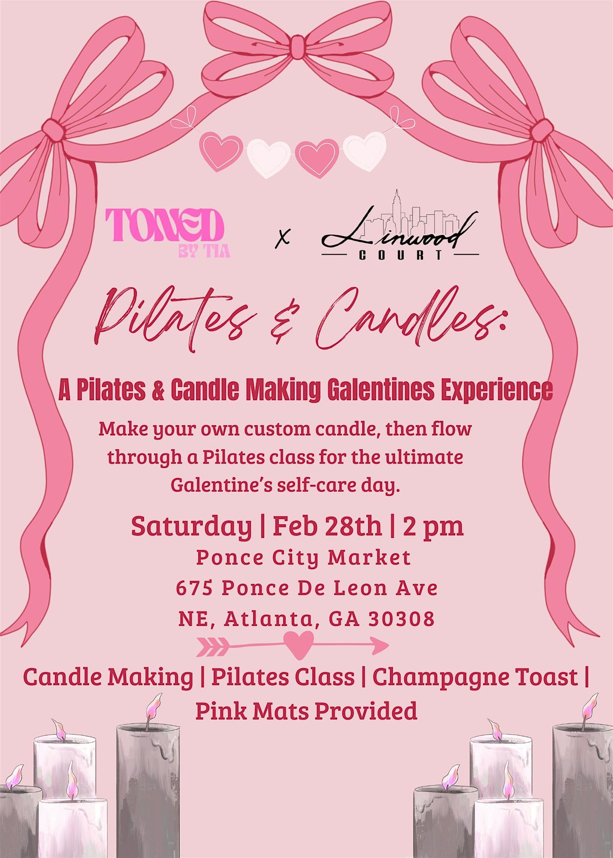 Join Toned by Tia for a cozy and uplifting Galentine’s afternoon at Linwood Court in Ponce City Market, centered around movement, creativity, and connection. This experience begins with a guided candle-making session, where guests will create their own custom candle to take home, followed by an intentional Pilates class designed to strengthen your core and help you feel grounded in your body.
