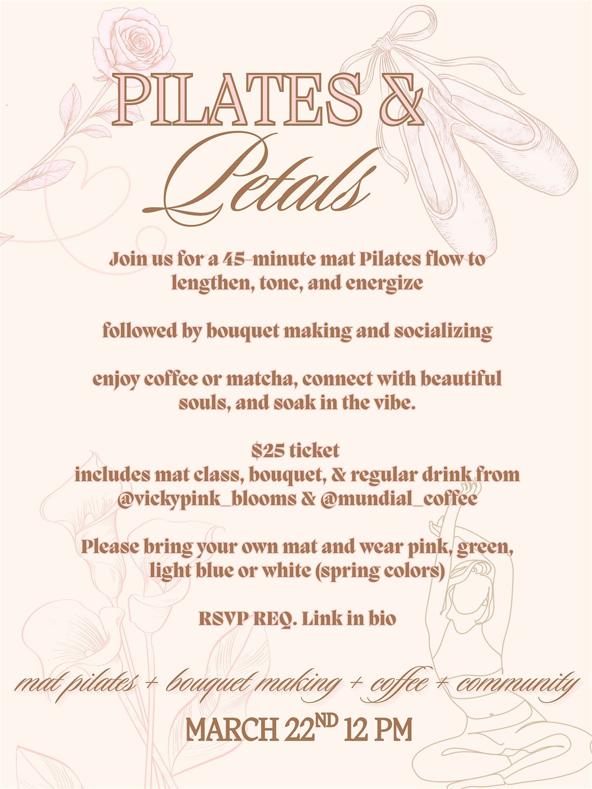 Get ready to stretch, strengthen, and bloom! Join me for this launch as you are led through a 45 minute pilates class followed by bouquet making (@vickypink_blooms) and a refreshment by Mundial Coffee! You'll enjoy a fun, power session perfect for all levels, surrounded by good vibes and good music. Whether you're a pilates pro or just looking for a new way to unwind or socialize, this event is for you. Don’t miss out on this experience to refresh your body and spirit!
