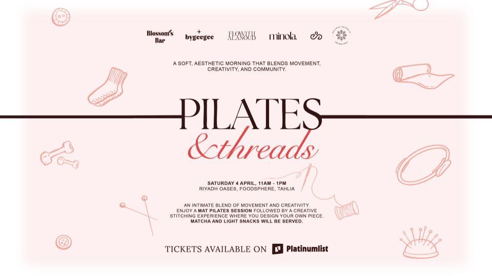 Join us for a unique mat Pilates class that focuses on strength, flow, and mindful movement, suitable for all levels, led by Alanoud Alomani. After the class, unwind and enjoy a creative stitching experience, where you can personalize your own charm for your phone, bag, or keys by choosing your favorite pieces and having them crafted live.