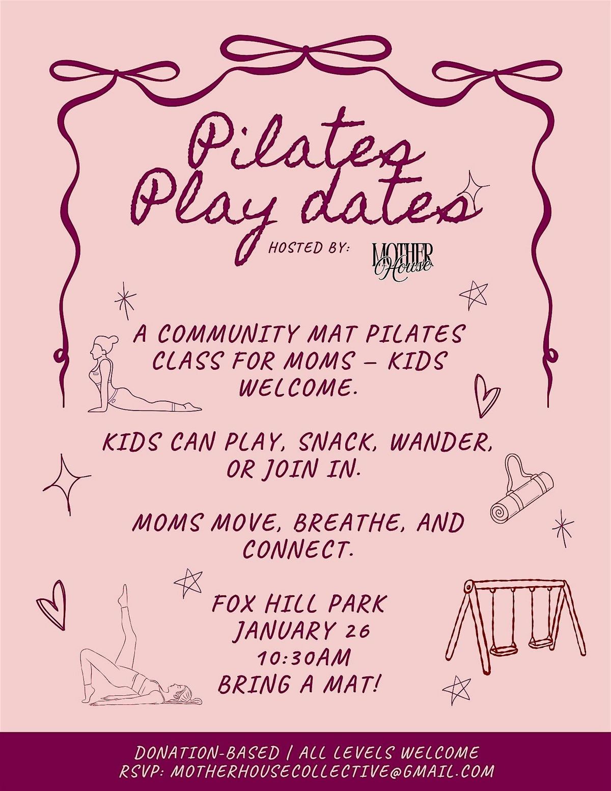Donation-based community mat Pilates class for moms — kids welcome.