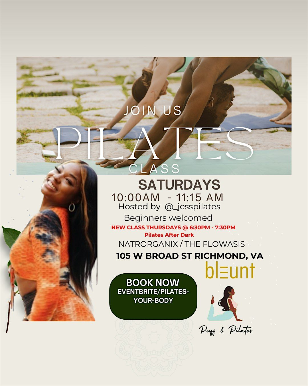 Welcome to Pilates Your Body!Get ready to stretch, strengthen, and tone with us in this awesome in-person Pilates session.