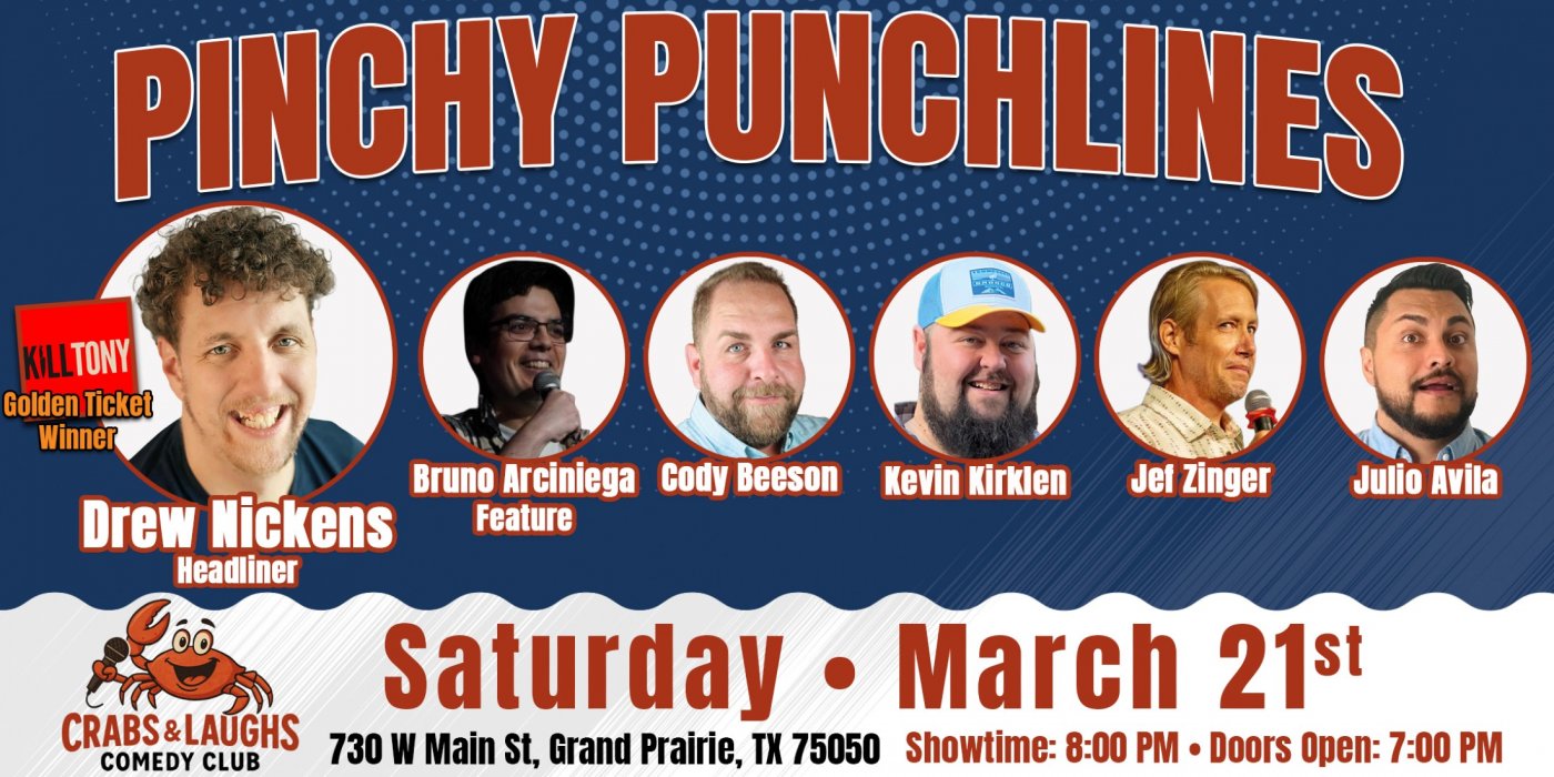 We are excited for Drew Nickens to be back in town on Saturday, March 21st at Crabs & Laughs Comedy Club in Grand Prairie, TX!