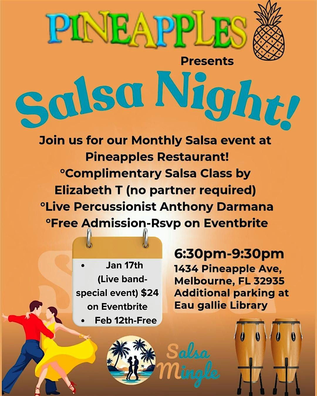 Come join us at Pineapples for a night filled with rhythm, fun, and lots of dancing! Salsa Mingle will be bringing their best moves to get everyone grooving on the dance floor. Whether you're a seasoned pro or a complete newbie, this event is perfect for anyone looking to shake it off and have a great time. Don't miss out on this opportunity to spice up your night with some hot salsa beats!