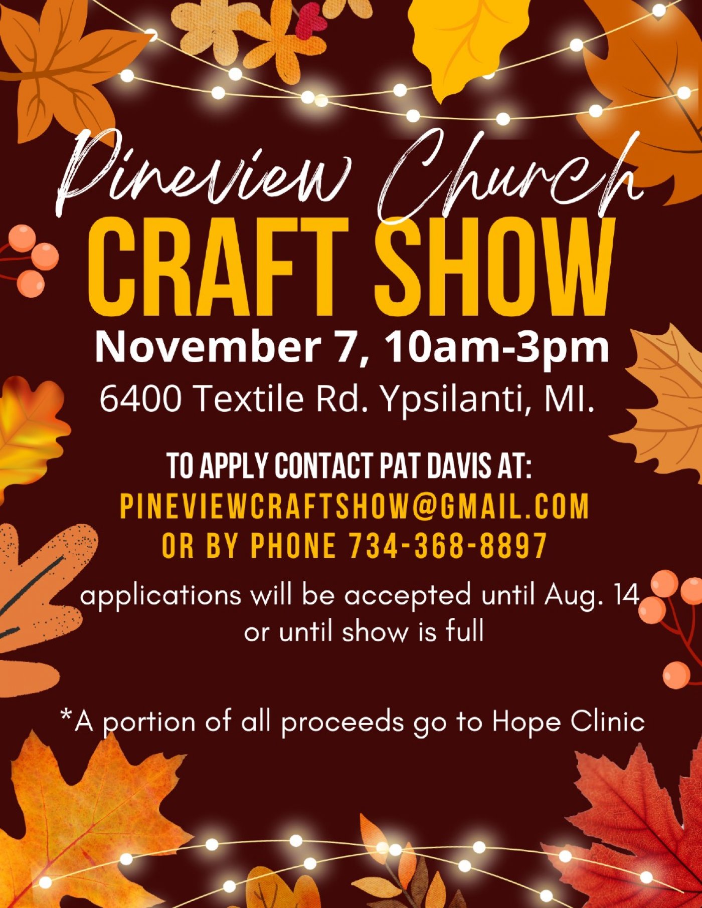 The Pineview Craft Show is an Indoor arts and crafts show featuring 50+ artisans locally and surrounding areas. Show includes door prize drawings, concessions, and baked goods. Free on-site parking. Admission is $2 (under 12yrs enter free), a portion of our proceeds will be donated to Hope Clinic. We are accepting applications now, until show is full. To receive an application or for more information, email [email protected] or call 734-368-8897.