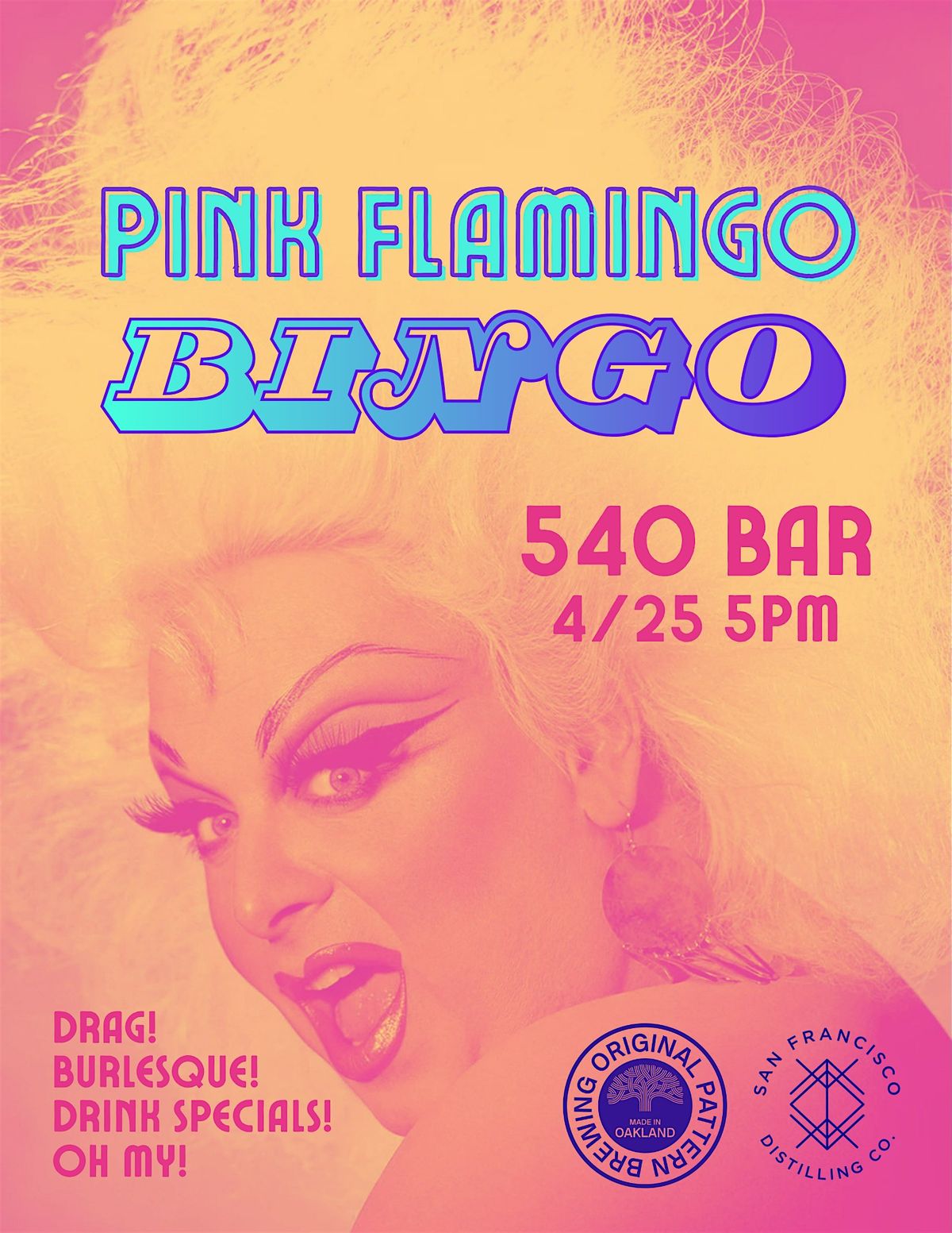 Pink Flamingo Bingo is back with free Bingo/Burlesque/Drag. No cover/2Drink Min/21+. Doors 4:30/show 5:00. 540 Bar/540 Clement St