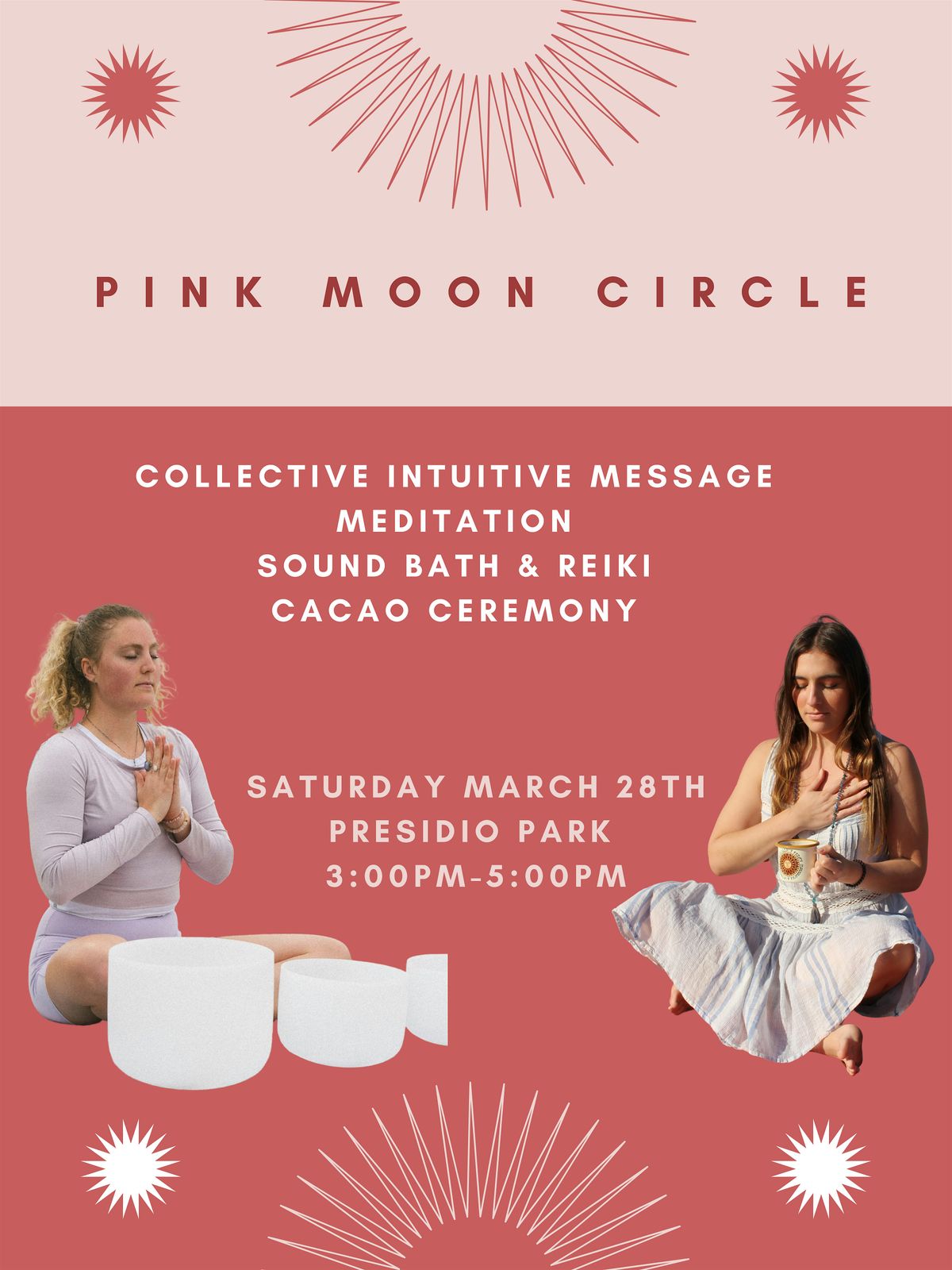 Come hang out in person for a chill afternoon as we prepare for the glowing Pink Moon. Itβs all about good vibes, connecting with awesome people, and soaking in the magic of meditation, sound healing & reiki, and cacao. Bring your open heart and curious spirit, and letβs make some memorable moments together. Donβt miss out on this cool gathering β see you there!