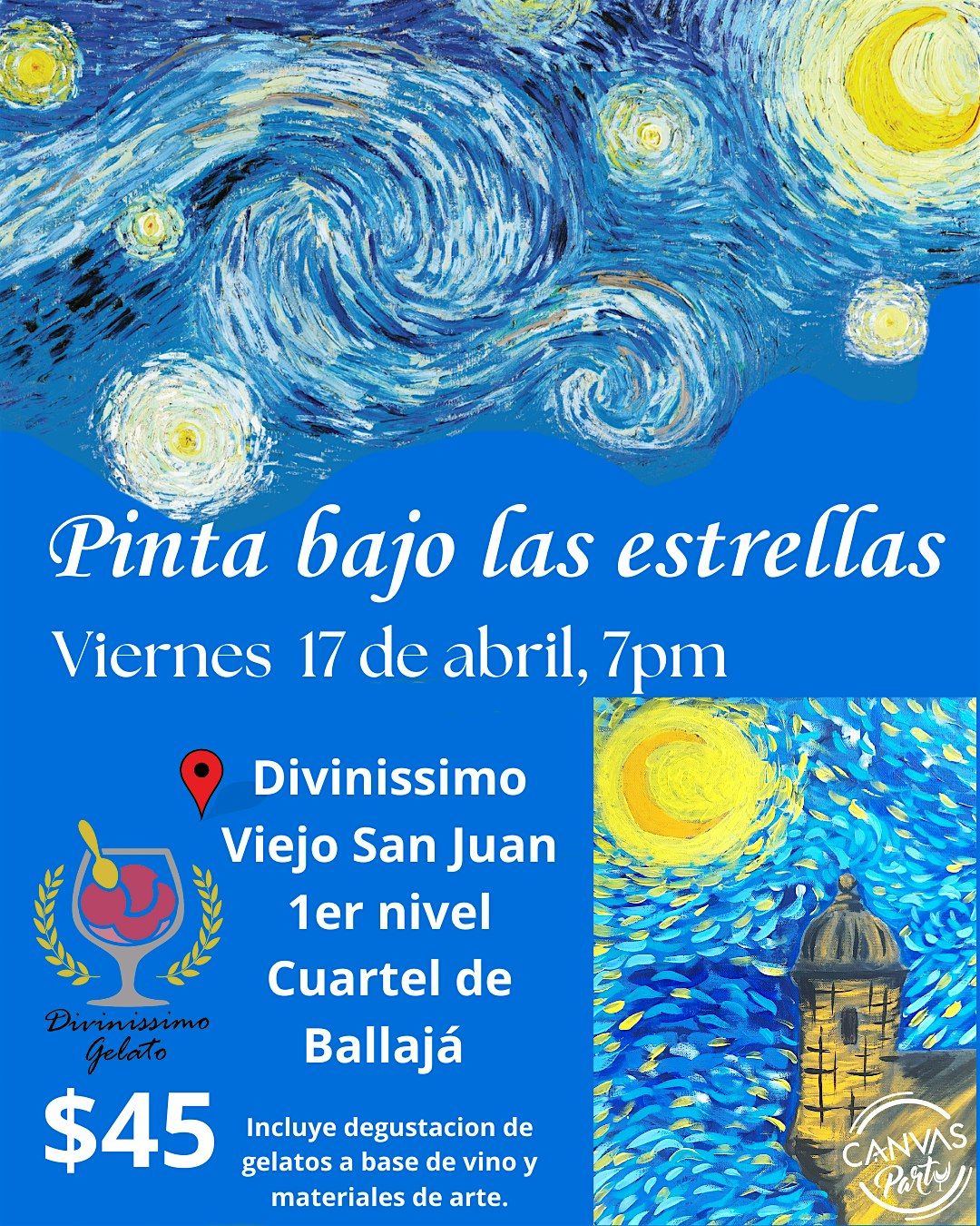 Dale rienda suelta a tu lado creativo! No importa si no tienes experiencia pintando, nosotros nos encargamos de guiarte paso a paso durante el proceso de creación de tu obra de arte. En esta ocasión estaremos pintando la noche estrellada de Van Gogh con un toque boricua.