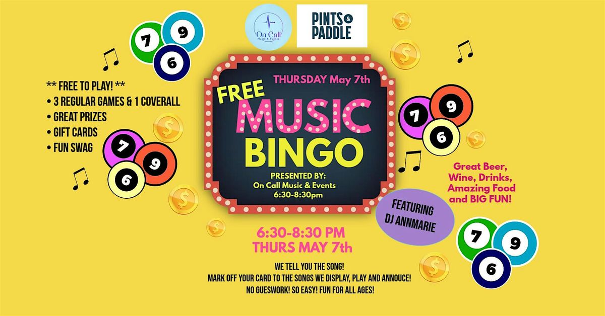 Join us on Thursday, May 7 for a high energy night of Music Bingo! Free to play All ages! Prizes!