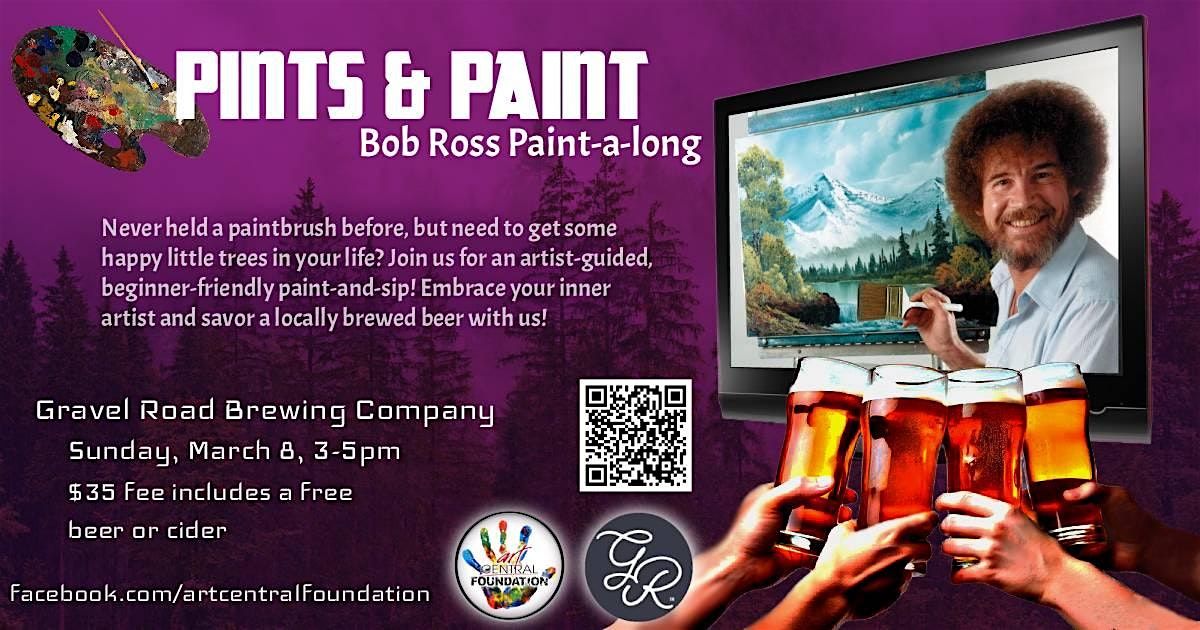 Pints & Paint at Gravel Road! Get a free drink with your ticket purchase and kick back by painting--open to all skill levels.--No pressure, no worries, just good beer and painting! Get your creative energy flowing with the help of Gravel Road's locally brewed beer--or grab a cider, wine, or soda--while painting along to a tutorial by the great Bob Ross. Always been too scared to face the happy little trees? Now is the time to seize the day! This is a completely beginner-friendly event, with an ACF artist guiding you through every step.