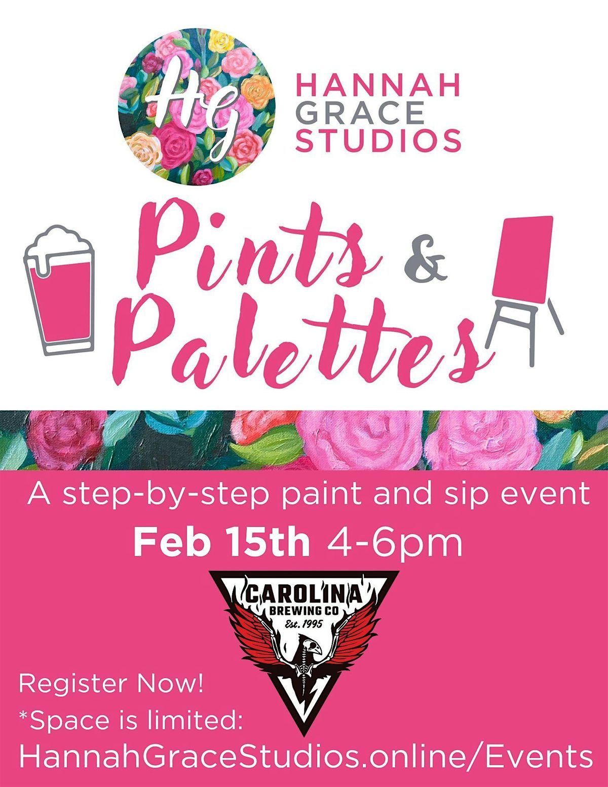 Join us for a fun-filled evening of creativity and craft beer at Carolina Brewing Company! Get ready for step-by-step instruction led by professional acrylic artist, Hannah Grace.