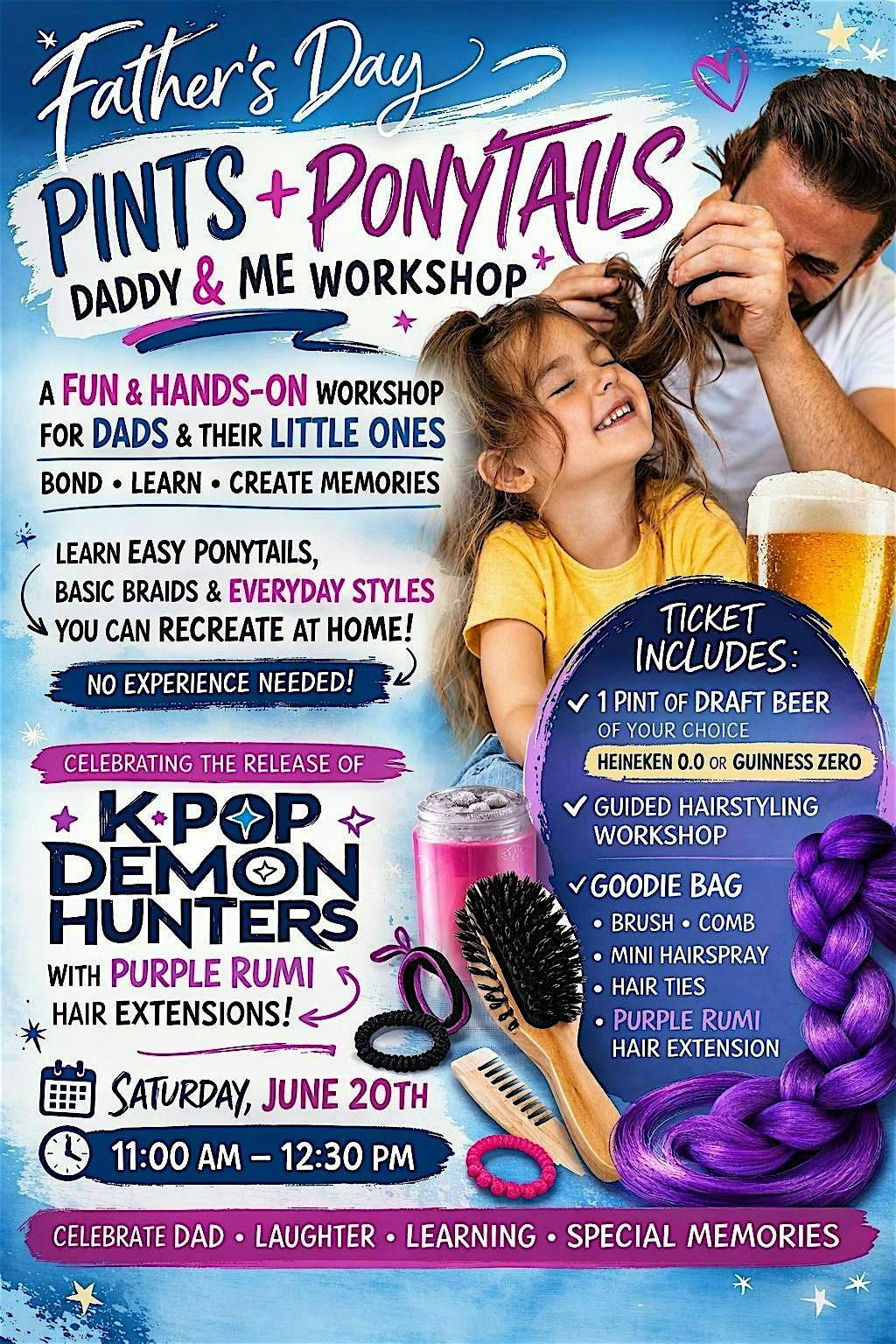 Celebrate Father’s Day weekend with a fun and memorable Pints + Ponytails Daddy & Me Workshop! This hands-on experience is designed for dads and their little ones to bond while learning simple, everyday hairstyling techniques together. Guided by a stylist, dads will learn how to create easy ponytails, basic braids, and practical styles they can recreate at home — no experience needed.