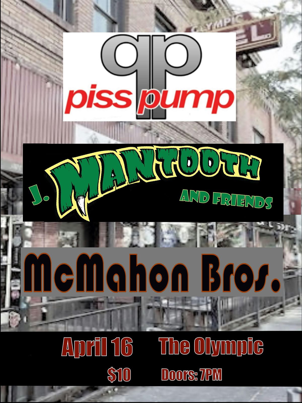 Get ready for a wild night with Piss Pump, J. Mantooth & Friends, and the McMahon Bros bringing the noise live!About this Event