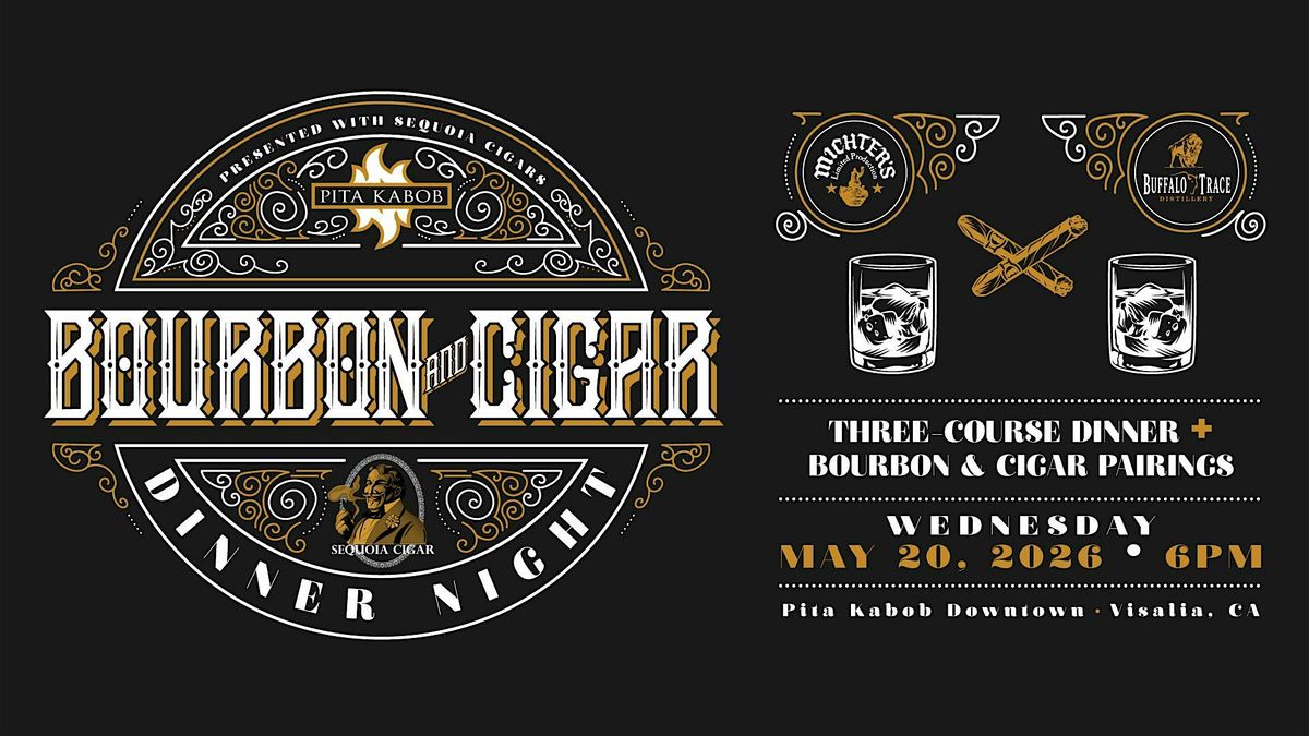 Join us at Pita Kabob Mediterranean Kitchen + Bar on Wednesday, May 20, 2026 at 6:00 PM (Pacific Time) for a Bourbon & Cigar Dinner evening brought to you by Pita Kabob x Sequoia Cigar Co. Enjoy a unique selection of bourbon flights paired with premium cigars selection curated by Sequoia Cigar Co. Our three-course dinner will feature a Wedge Salad, New York Steak or Salmon, Cheesy Scalloped Potatoes, Sauteéd Vegetables and a Salted Bourbon Caramel Cheesecake. A light appetizer will also be included.