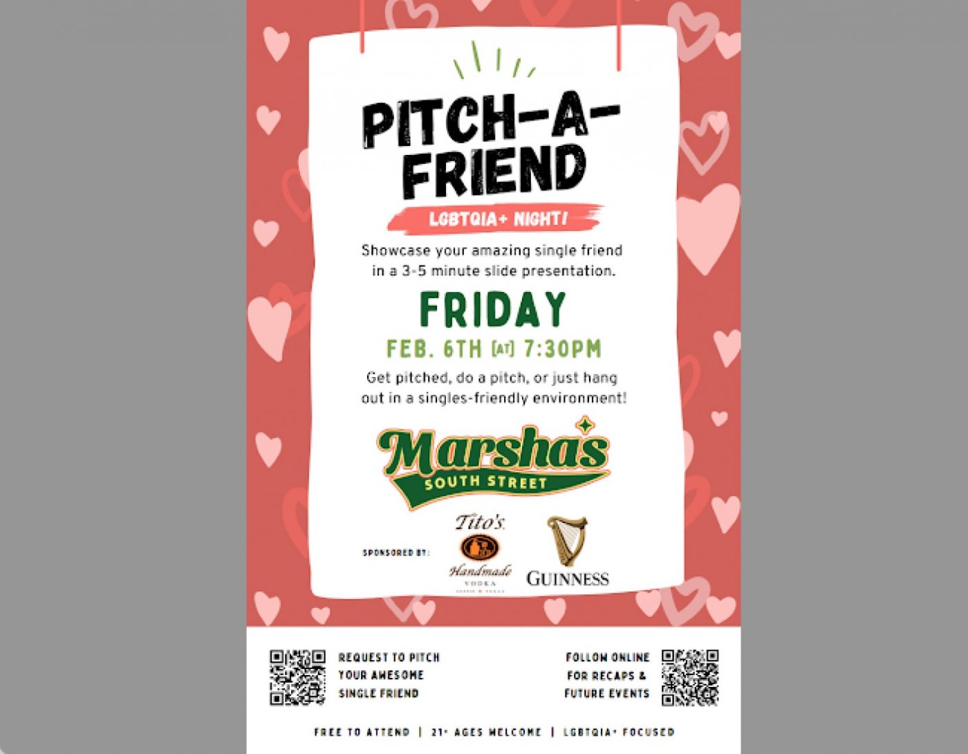 Join us Friday, February 6 at 7:30 p.m. for Pitch-A-Friend: LGBTQIA+ Night at Marsha’s South Street! An event where friends can pitch their single friends in quick, fun presentations. A low-pressure, singles-friendly night focused on connection, laughs, and queer community.