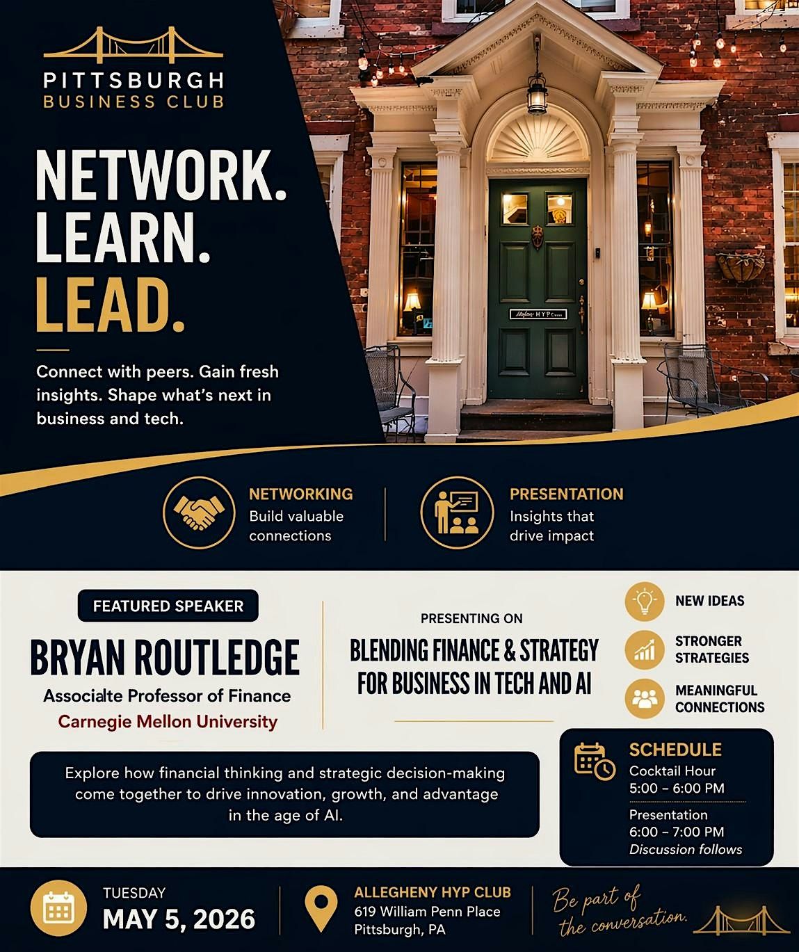 A new series of presentations here at the AHYP presented by the newly formed Pittsburgh Business Club. The first of which will be on Tuesday, May 5th and feature Bryan Routledge, Associate Professor of Finance at CMU.