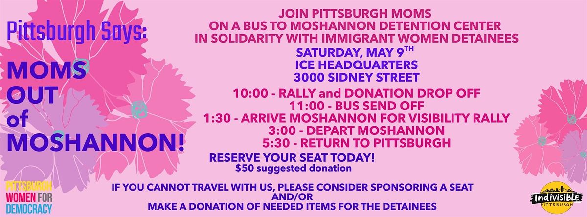 Our day will begin at10am in Pittsburgh with a visibility event in front of the Pittsburgh ICE headquarters (3000 Sidney St). We welcome families to come with their children to see off the mothers who will be heading to the Moshannon immigrant detention center. We encourage moms to print out a photo of themselves and their child(ren)or of themselves with their own mom and bring the photo. Also - feel free to dress up for Mother's Day. We will also collect donations for the women held at Moshannon. Please see the FAQs for needed items.