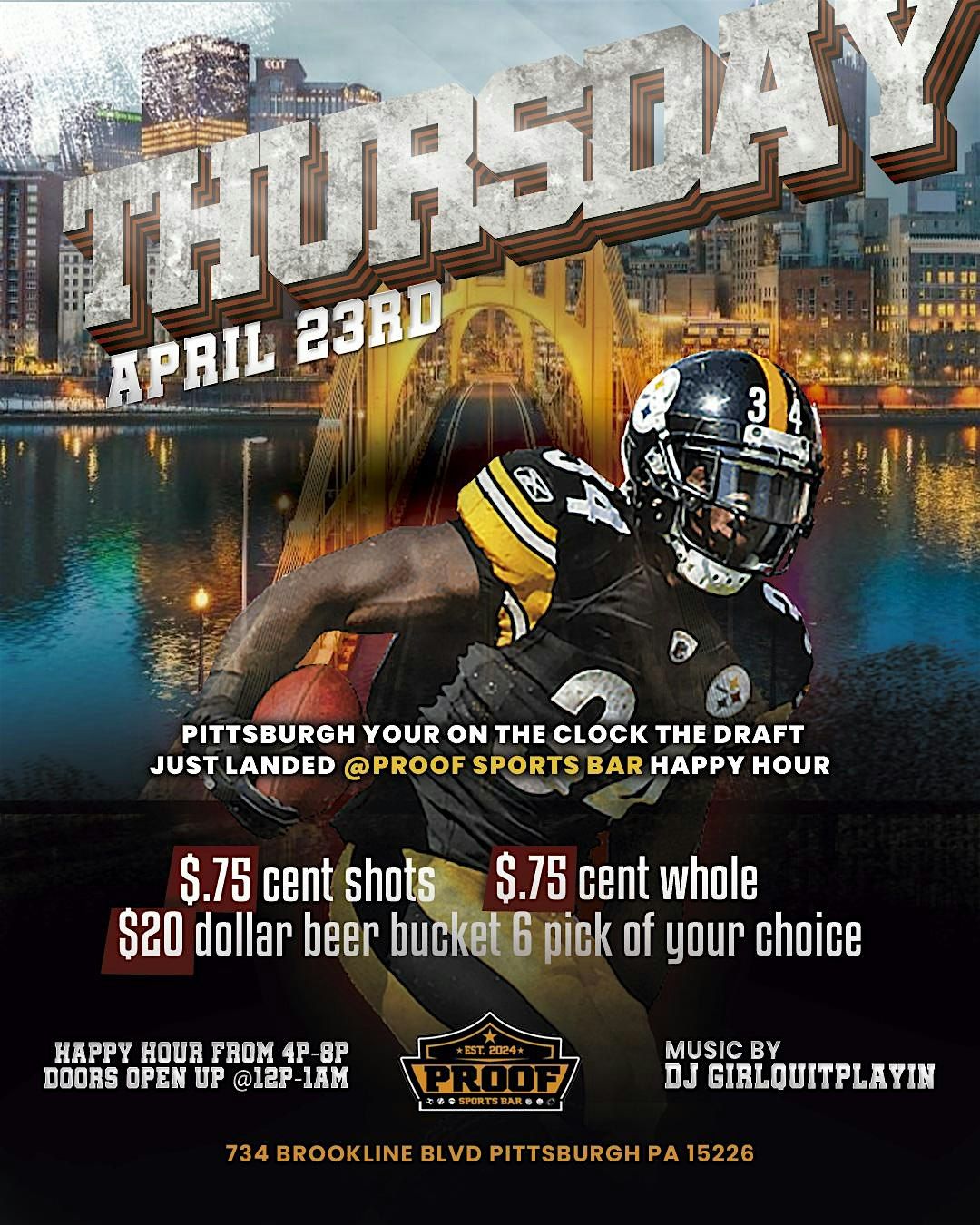 Thursday, April 23rd, it’s your turn, Pittsburgh—Draft Night is going down at Proof Sports Bar. Pull up and experience the city’s energy as the draft unfolds with a packed crowd, high vibes, and nonstop music by DJ GirlQuitPlayin.