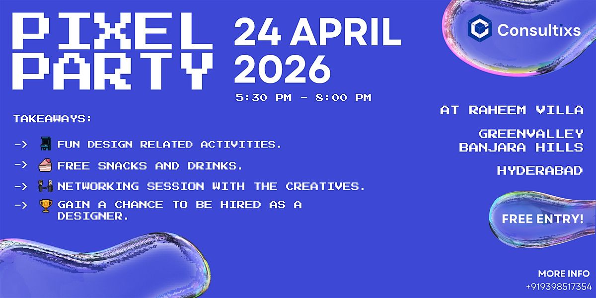 Pixel Party by Consultixs is a creative networking event for designers, founders, and students in Hyderabad.