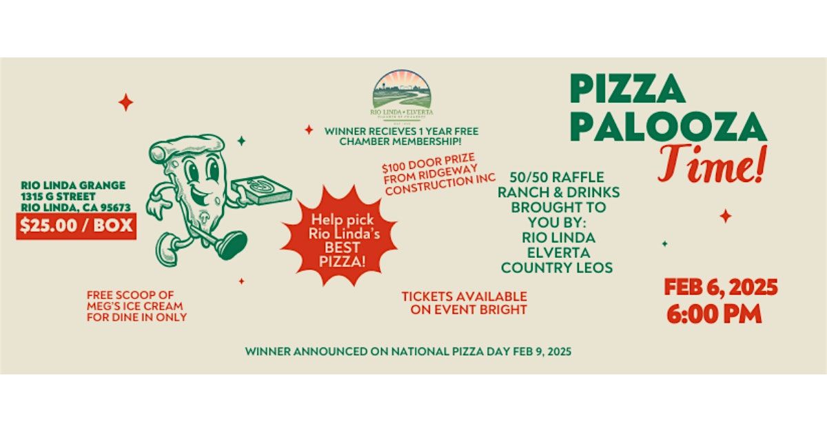 The Rio Linda/Elverta Chamber of Commerce, co-hosting with the Rio Linda Grange, invites the community to a Blind Pizza Taste Test featuring slices from eight local pizza spots. **Each ticket includes eight slices to sample—equal to half of a pizza—**allowing guests to taste and vote for their favorite. The pizza place receiving the most votes will be awarded a one-year Chamber membership. Attendees may choose to dine in and enjoy a free scoop of ice cream from Meg’s Creamery, or take their pizza to go. The Rio Linda Country Leos will be on site serving drinks and ranch, and guests can also participate in a 50/50 raffle and a door prize sponsored by Ridgeway Construction.