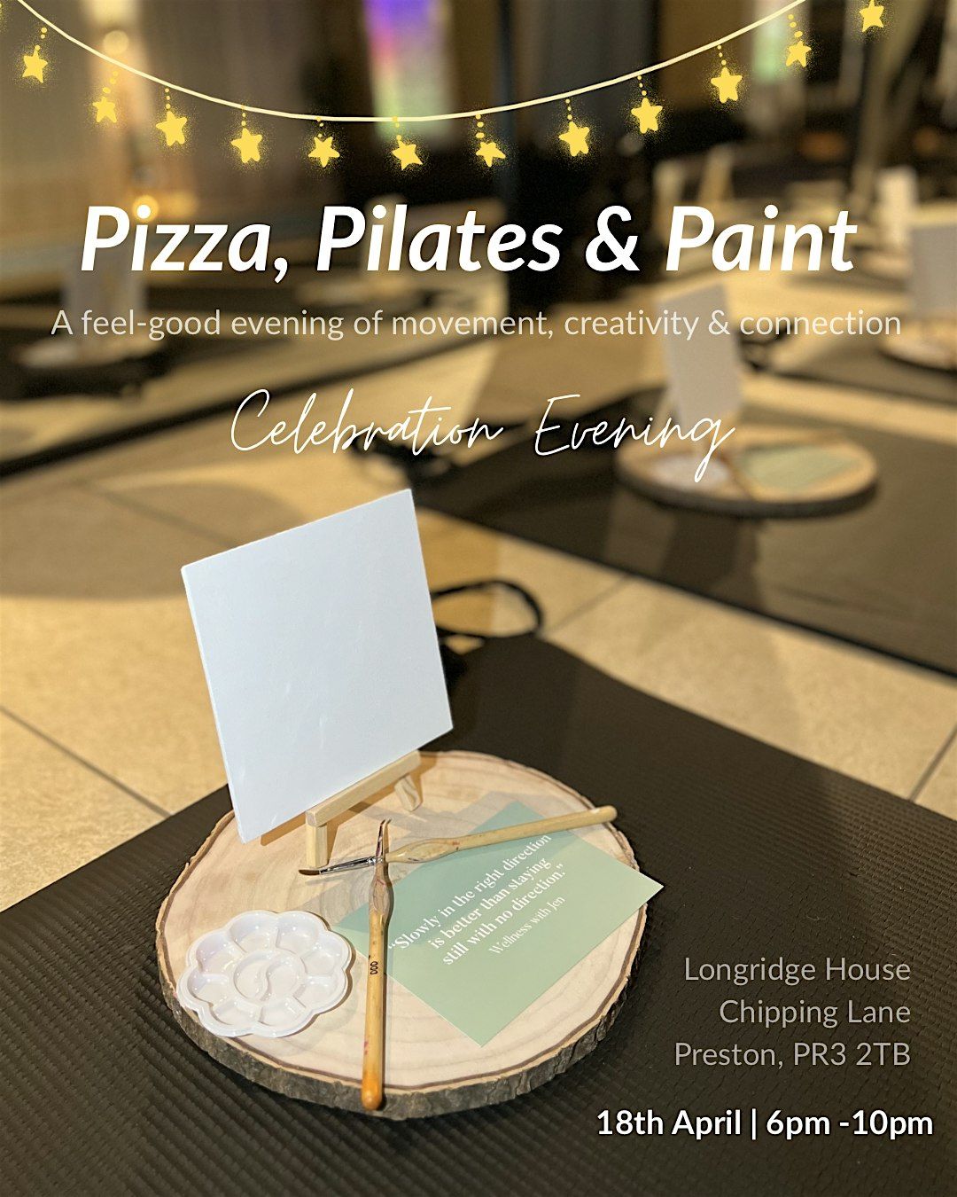 Includes Pilates session, guided painting, all materials and food.