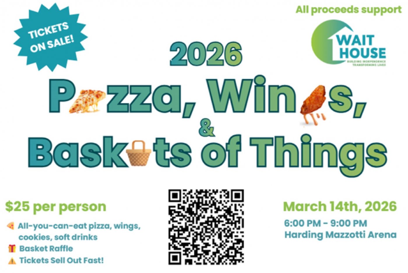 WAIT House invites the community to its popular annual fundraiser, Pizza, Wings & Baskets of Things, on Saturday, March 14, 2026, from 6:00–9:00 PM at Heritage Hall at the Harding & Mazzotti Arena in Glens Falls.
