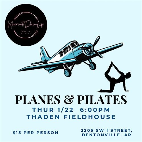 Movement Driven Life, NWA's first mobile fitness studio, is leading this fun, all-levels mat Pilates class inside the beautiful exhibition hangar of Thaden Fieldhouse!