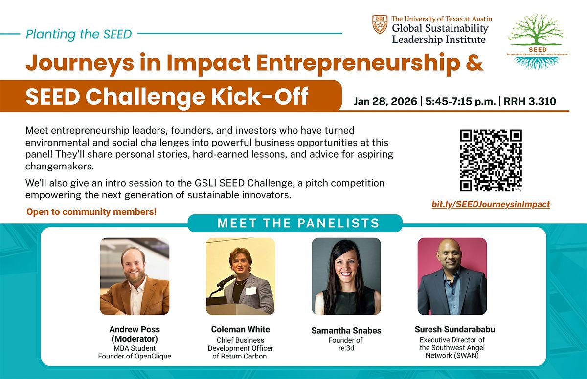 We’ll also give an intro session to the GSLI SEED Challenge, a pitch competition empowering the next generation of sustainable innovators. All UT Austin students are eligible to compete for $15k in seed funding. Example SEED Companies Include: Spice-A-Bowl, Gazelle Ecosolutions, Apovo, Front Row, Merge Conflict Studios, Verified Carbon, and more!