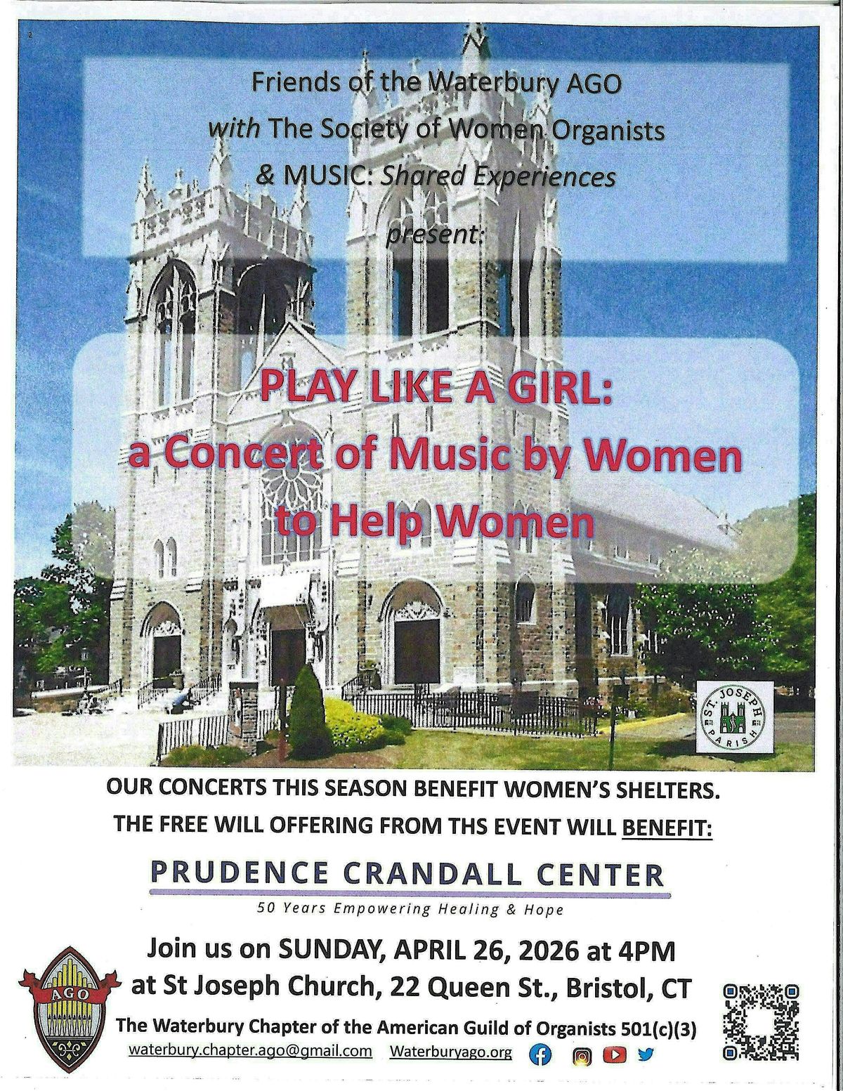 Join us for a free concert of music composed by women. Free reception. Free will offering taken to benefit Prudence Crandall Center