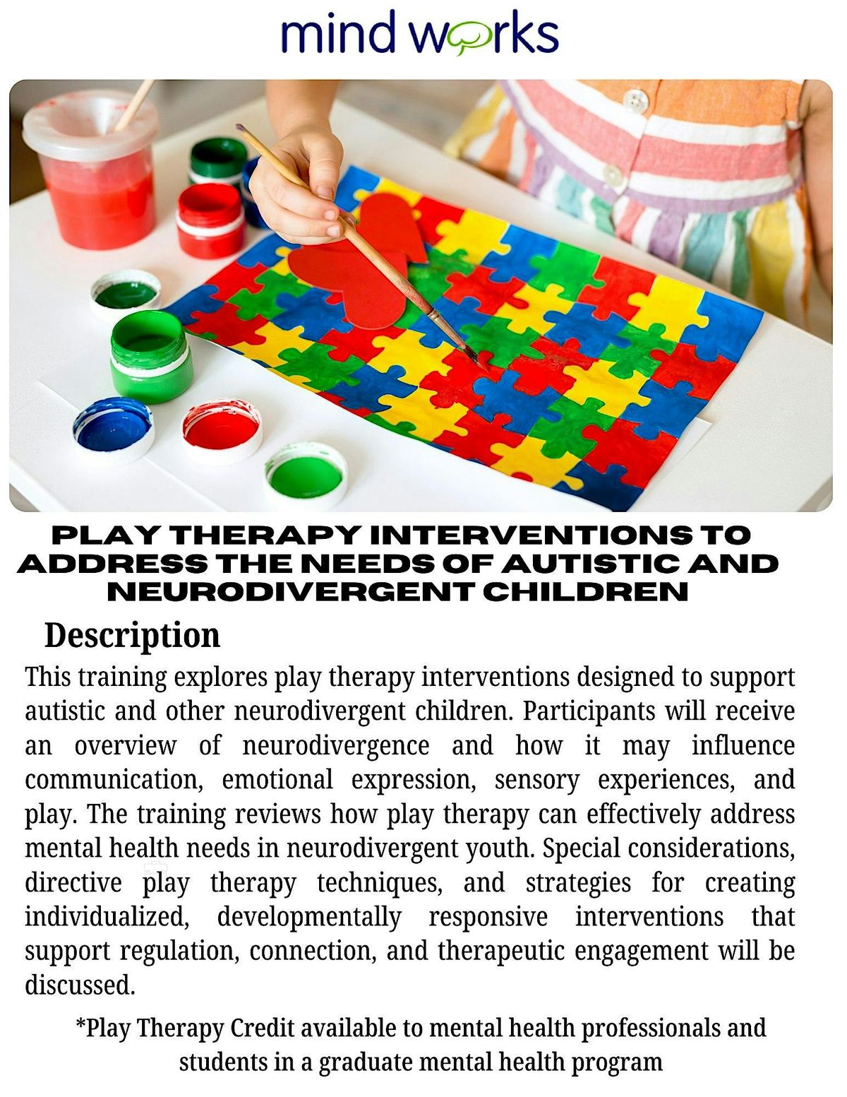 1) Implement play therapy approaches to address mental health needs of autistic and other neurodivergent children and adolescents.