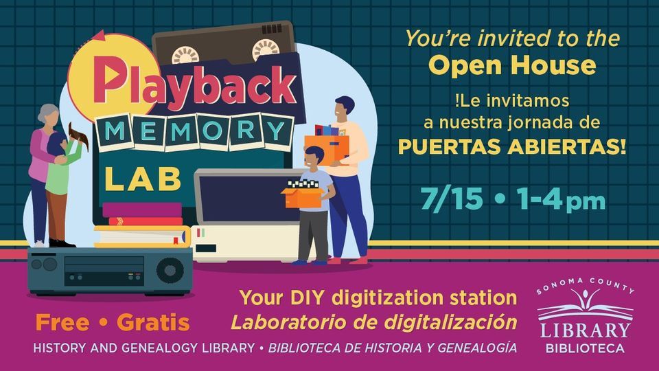 We are excited to announce the launch of our Do-It-Yourself Playback Memory Lab at the Sonoma County History & Genealogy Library! Join us for an Open House, Saturday, July 15, 1-4 pm and be the first to explore our state-of-the-art digitization lab. Watch a short orientation video, learn how to make an appointment, and feel free to ask us any questions you may have.