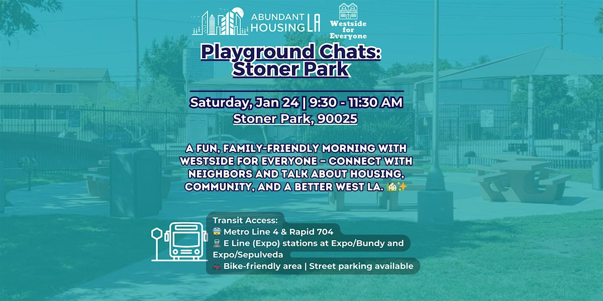 Join Abundant Housing LA and Westside for Everyone for Playground Chats at Stoner Park in West Los Angeles. This relaxed, family-friendly gathering is a great way to meet neighbors, learn more about housing on the Westside, and talk about how we can make our communities more welcoming and affordable.