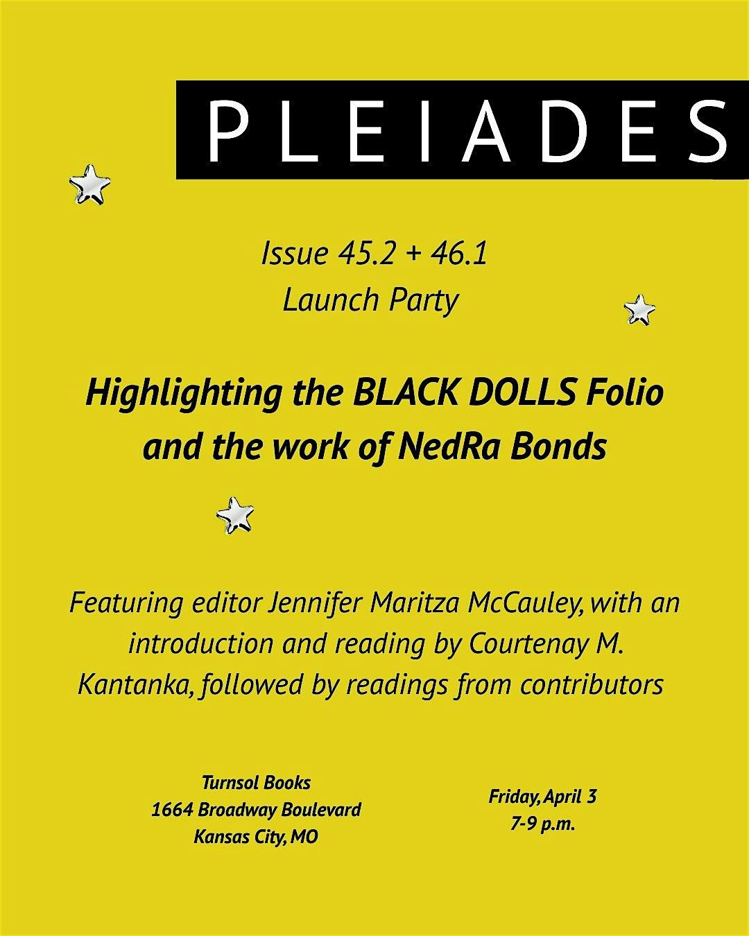 Please join us to celebrate the launch of Pleiades' latest double issue. We'll be celebrating the issue with a reading from our special Black Dolls folio. This special folio, edited by Jennifer Martiza McCauley, responds to the work of NedRa Bonds, acclaimed artist, quilter and activist recently exhibited at The National Museum of Toys and Miniatures.