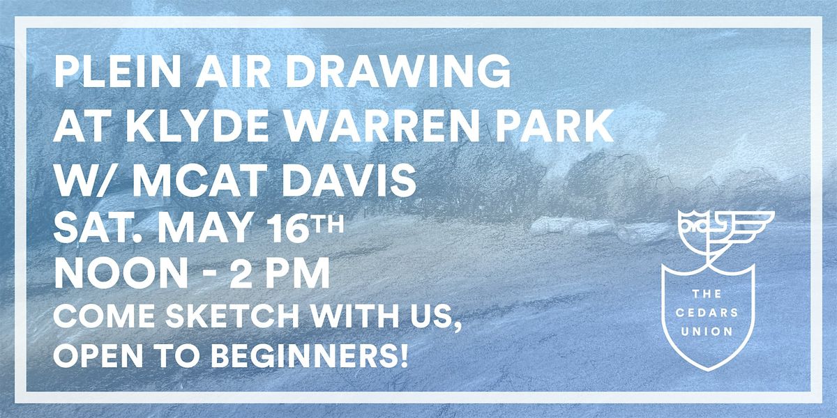Join The Cedars Union and Cohort 5 member MCat Davis for a plein air drawing session at Klyde Warren Park. This laid-back group drawing excursion will focus on rendering the landscape and architecture of downtown Dallas. All levels welcome with some supplies provided but we encourage you to bring any preferred dry media!