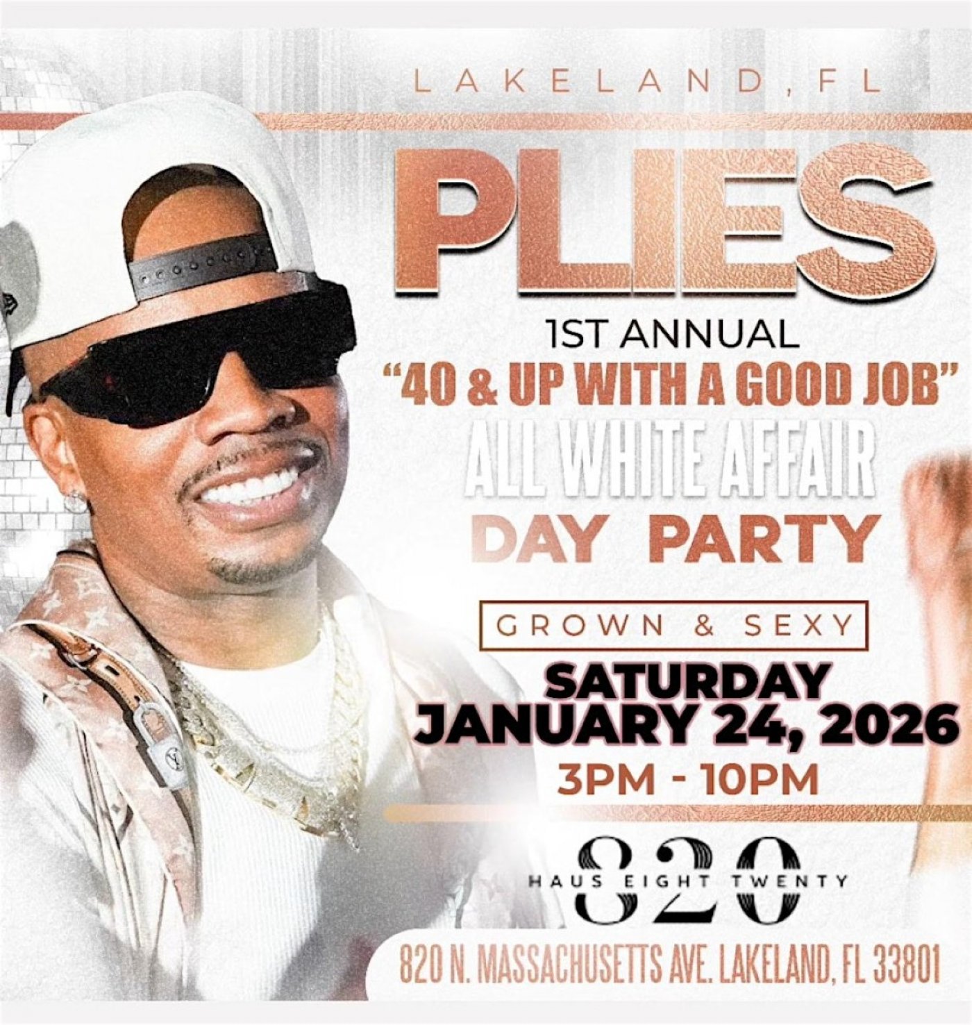 Join Fourlife Promotions, Likely Boyz, K Boy, and Nixclusive Events for Plies All White Affair 40 & Over with a Good Job. "Polk County Edition" Saturday, Jan 24 at Haus 820 in Lakeland, Florida.