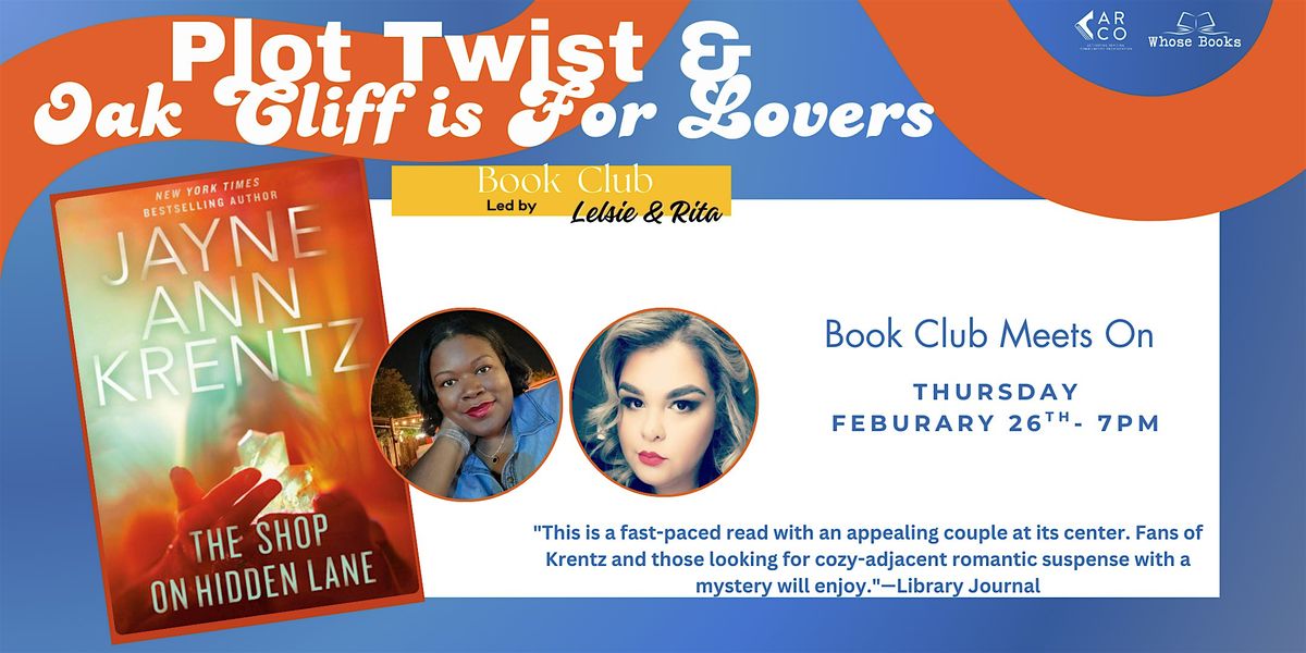 Join Plot Twist & Oak Cliff Is for Lovers Book Club, led by Leslie & Rita, for an engaging discussion of The Shop on Hidden Lane by Jayne Ann Krentz—a fast-paced romantic suspense novel filled with intrigue, secrets, and sparks.