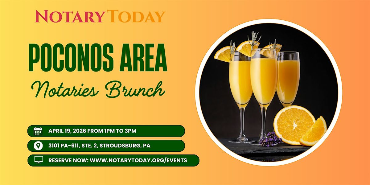 Join us for a fun and casual brunch at 3101 PA-611 ste 2! It's happening on April 19th, 2026 at 12:00 PM (Eastern Daylight Time). Come meet fellow notaries, share stories, and enjoy some great food in a relaxed setting. Don't miss out on this chance to connect and unwind with the community. See you there!