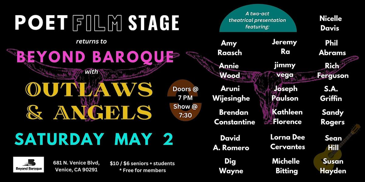 Poet Film Stage returns to Beyond Baroque for a one-night performance. This year’s theme, Outlaws & Angels, unfolds as a 75-minute program shaped by a live score, where music threads through poetry, vignettes, and film, connecting each moment into a cohesive, emotionally rich visual narrative.