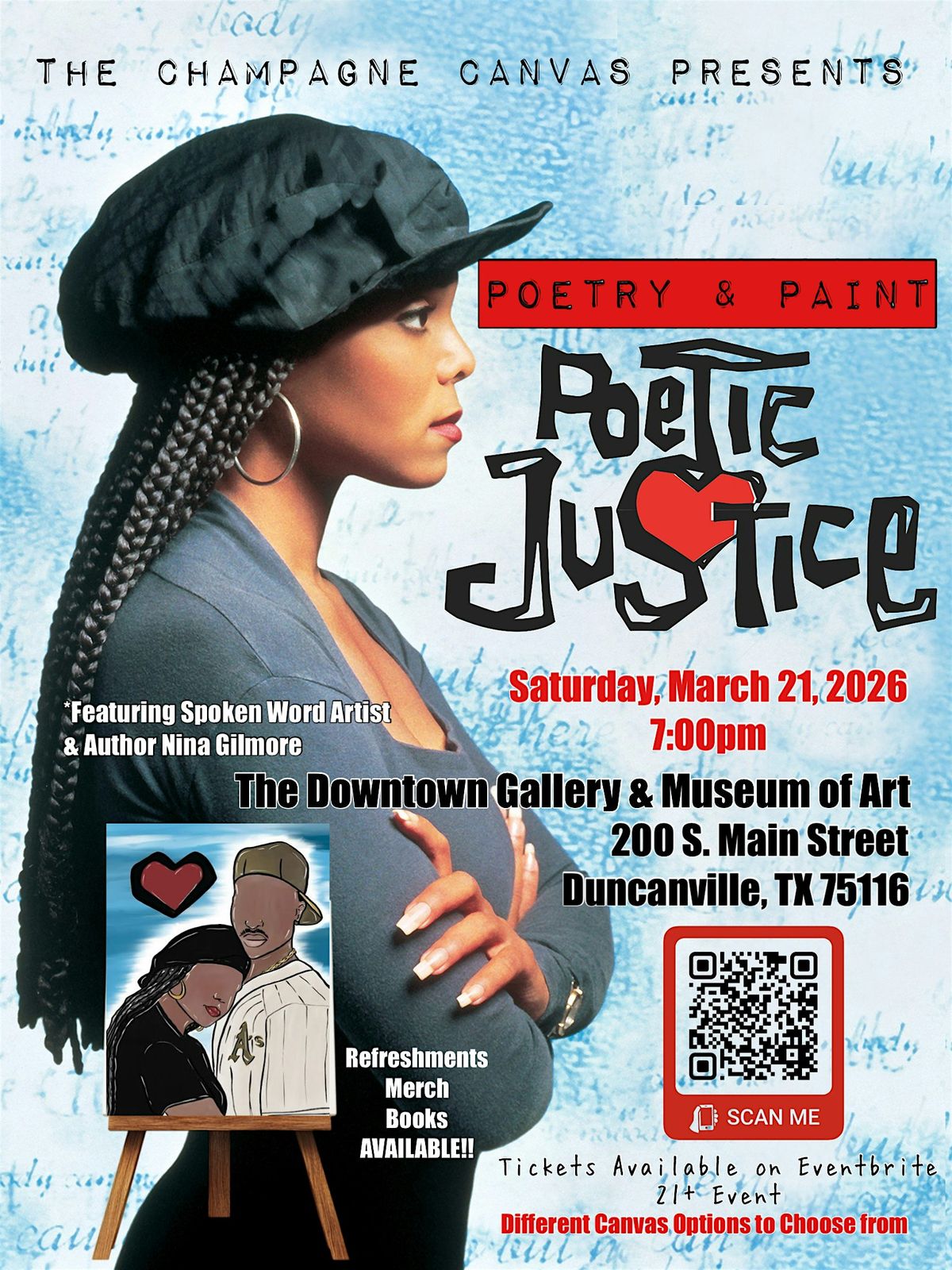 Guests will enjoy a paint session while sipping their favorite beverages and vibing to smooth R&B and neo-soul sounds that capture the essence of the era. In true Poetic Justice fashion, the evening will also feature an open-mic poetry experience where voices, stories, and emotions take center stage.