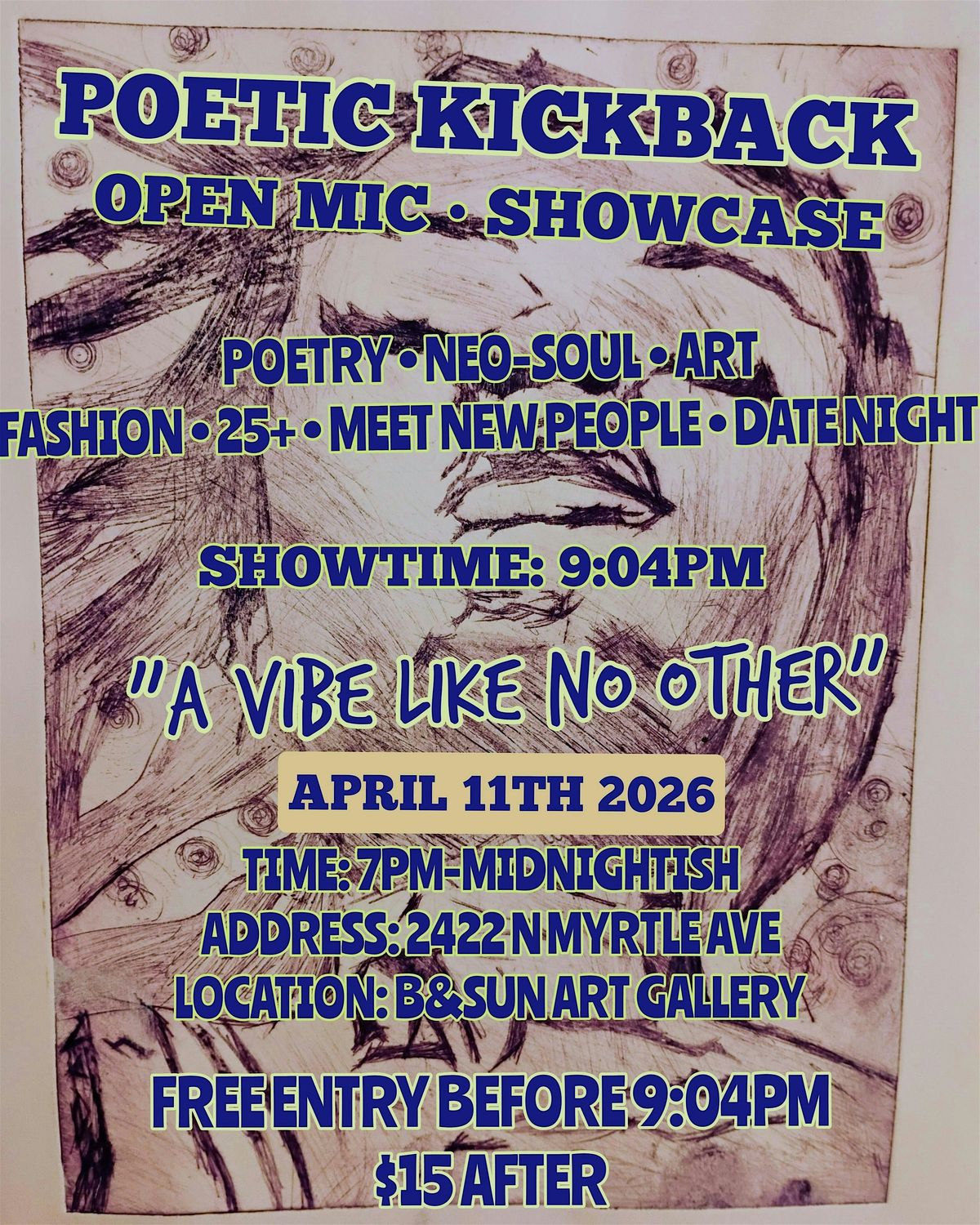 25+ • POETRY • ART • NEO-SOUL • SPOKEN WORD • FASHION NETWORKING • MEET NEW PEOPLE • DATE NIGHT INDOOR & OUTDOOR LIVE ENTERTAINMENT • SHORT FILM • VENDORS • CREATIVE EXPRESSION