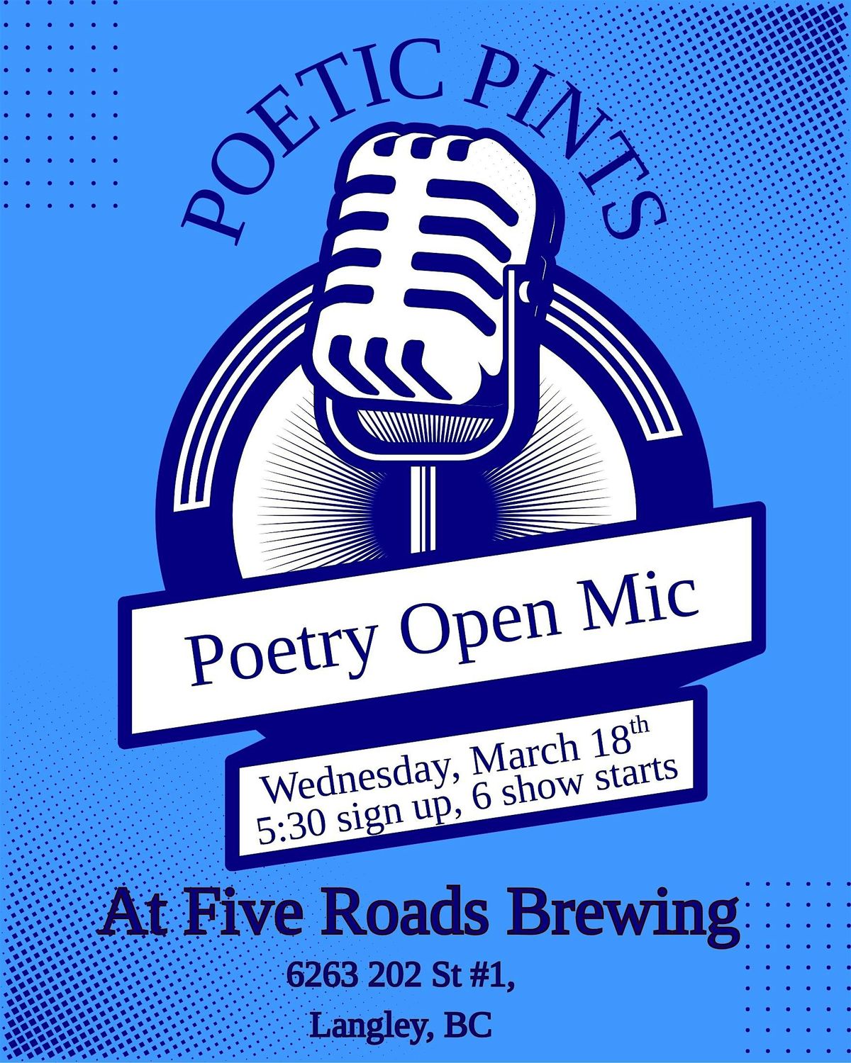 Come join us at Five Roads Brewing for a night of poetry, performance and great drinks! Whether you're a seasoned poet or just starting out, our open mic event is the perfect place to share your creative work. We also welcome musicians, aspiring comedians and other forms of performance art. Folks will have a 5 minute slot to share their art. Expect fun surprises throughout the show for perfromers and audience members. See you there!