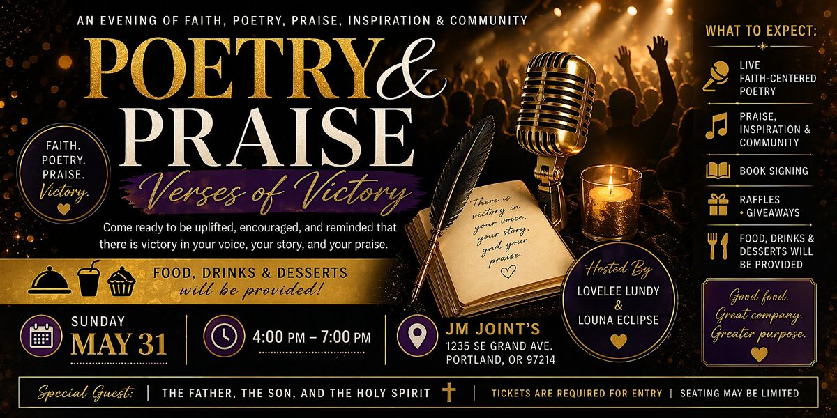 Join us for an unforgettable evening of faith, poetry, and powerful connection at Poetry & Praise: Verses of Victoryâa space where voices rise, hearts are restored, and purpose is ignited.