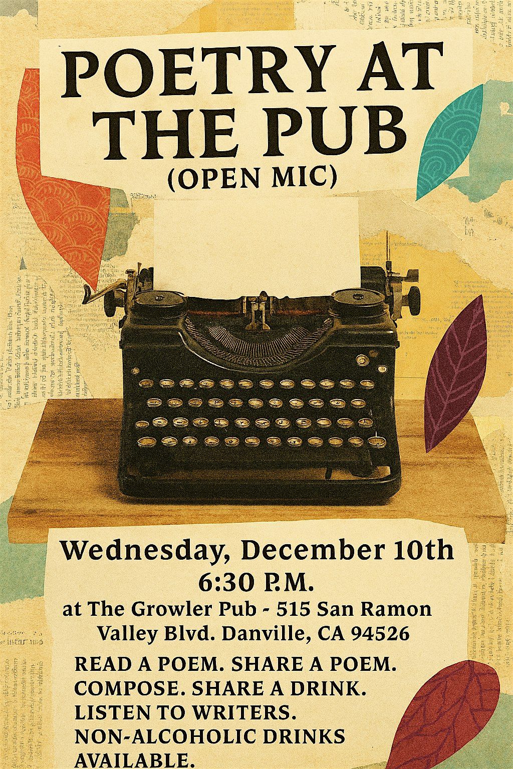 Come join us for a cozy evening of open mic poetry at The Growler in Danville (515 San Ramon Valley Blvd). Let your creativity flow and share your favorite poems with a friendly crowd. Whether you're a seasoned poet, a regular listener, or trying it out for the first time, everyone is welcome!