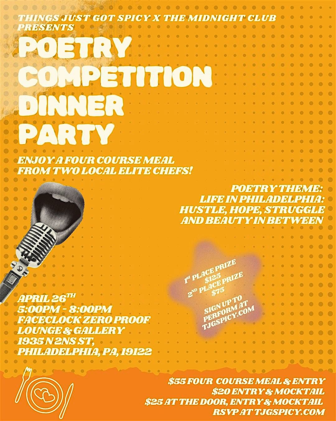 Things Just Got SpicyπΆπ₯ is back for a fifth season βΌοΈβΌοΈ Join us on April 26th from 5:00PM - 8:00PM at @faceclockgallery for our season five preliminary event. This is a classic poetry slam competition with a twist! A night of storytelling, passion, community, a four course meal from two local elite chefs and a mocktail from FaceClock! Truly an experience to remember πΆπ₯ RSVP at tjgspicy.com required for all dinner guests, no walk ins for dinner guests. Lounge guests may RSVP, walk ins are open. RSVPs close April 17th. Dinner and show ticket: $55 Lounge, show only ticket: $20 ($25 at the door) Perfomers sign up at tjgspicy.com 1st place prize: $150 2nd place prize: $100