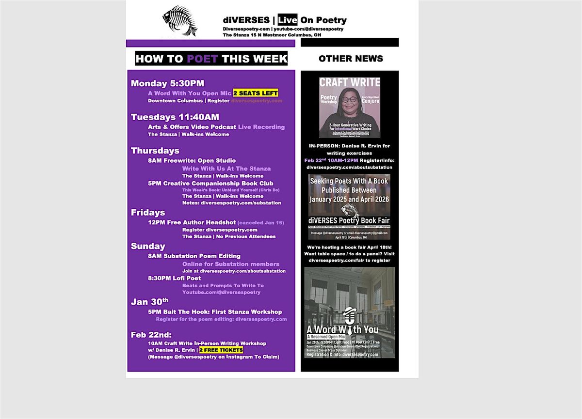 1) We're less than a month away from our first in-person edition of the Craft Write poetry workshop series. Facilitator Denise R. Ervin is coming through to guide us on a 2-hour journey into generative writing with a focus on intentional word choice!