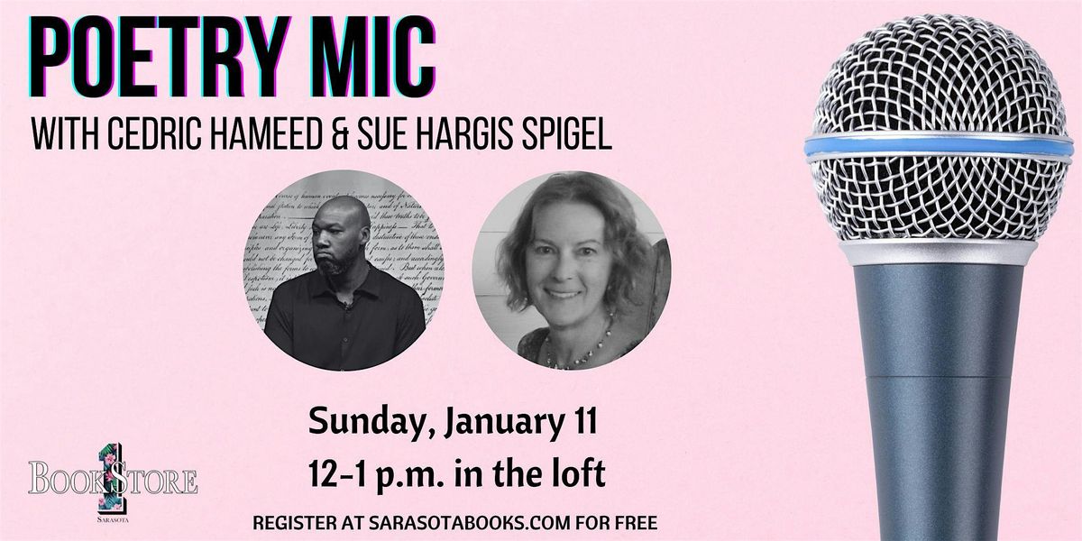 Our free Poetry Mic series introduces you to a varied group of talented poets who live in and around Sarasota. Plus, you never know what visiting, well-known poets may drop by the loft! Join us this week as CEDRIC HAMEED and SUE HARGIS SPIGEL share their work.