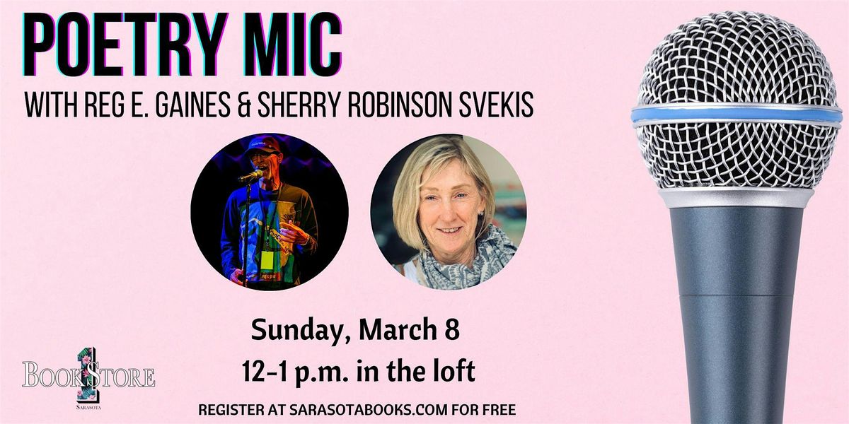 Our free Poetry Mic series introduces you to a varied group of talented poets who live in and around Sarasota. Plus, you never know what visiting, well-known poets may drop by the loft! Join us this week as REG E. GAINES and SHERRY ROBINSON SVEKIS share their work.