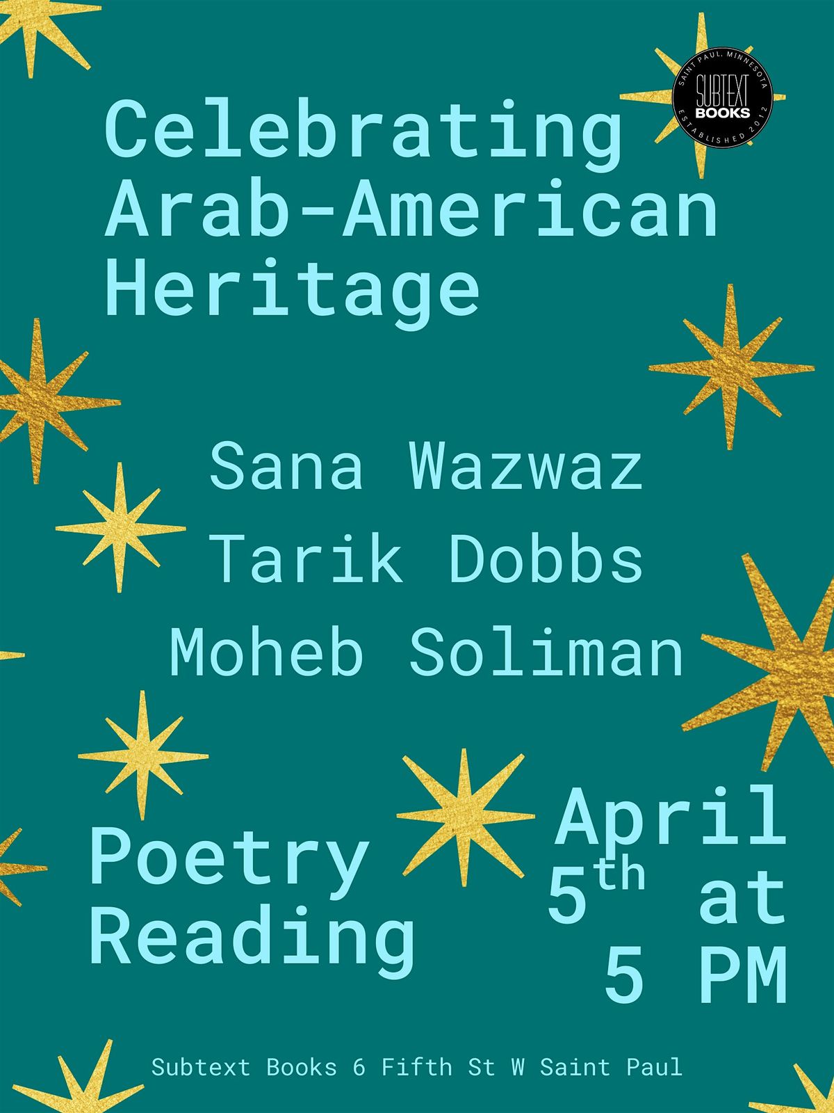 This event is free. Moheb Solimans debut poetry collection, HOMES, as well as Tarik Dobbs' debut poetry collection, Nazar Boy (2024) will be for sale at the event. We encourage you to attend Sana's upcoming public reading of "Birthright Palestine", a play in-development with New Arab American Theater Works: https://www.newarabamericantheaterworks.org/playwright-incubator-program
