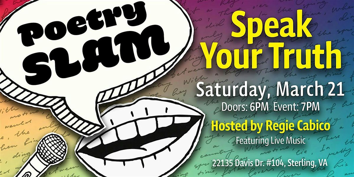 Doors open at 6:00PM with refreshments and live music. The Poetry Slam begins at 7:00PM with host Regie Cabico, and more music throughout the evening.