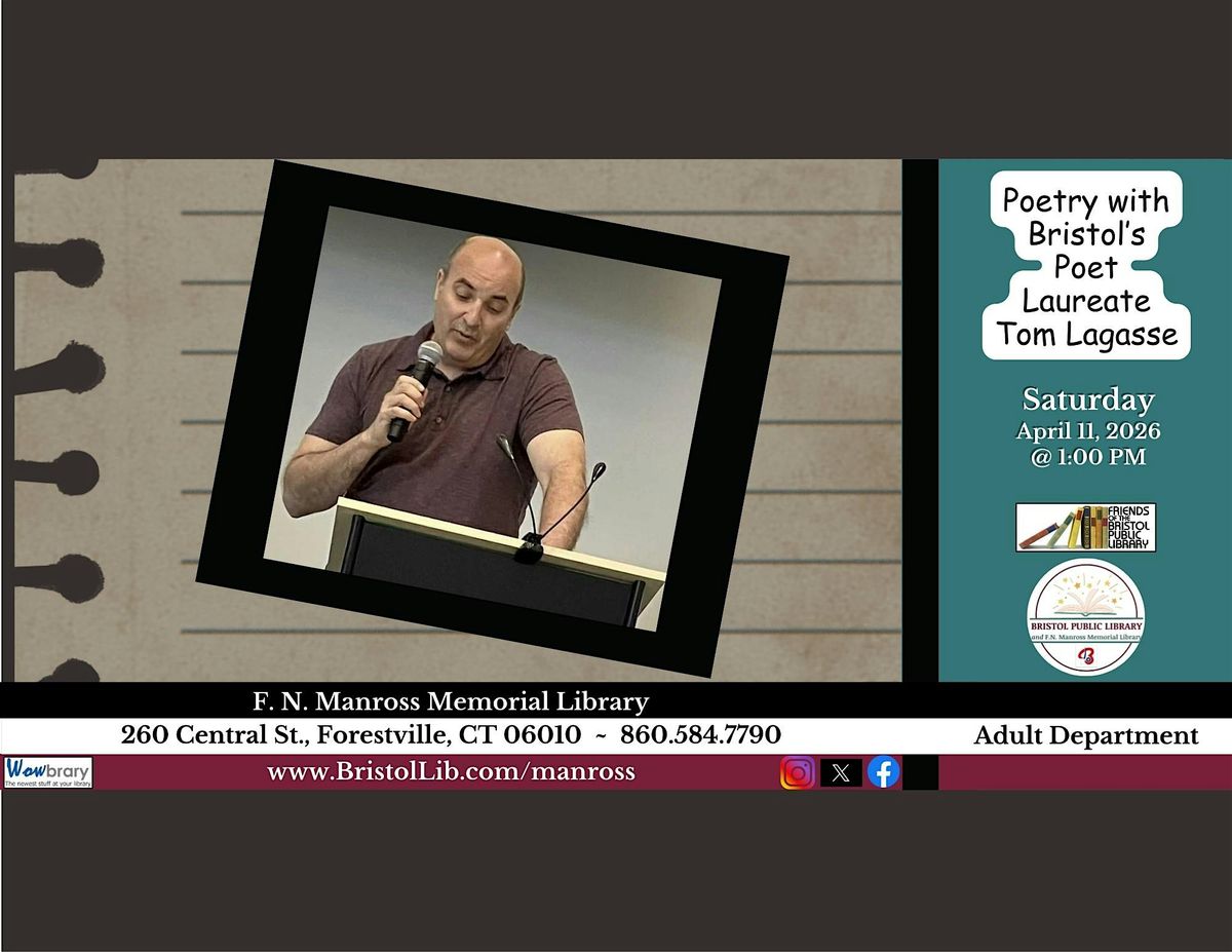 April is National Poetry Month and what better way to celebrate it than experiencing live poetry! Three established Connecticut poets, Dale Lombardi, Elaine Nadal, and Karen Warinsky will join Tom Lagasse, Bristol's Poet Laureate, for a reading of their work. Please sign up with a phone number for one confirmation call. Manross Library #860-584-7790