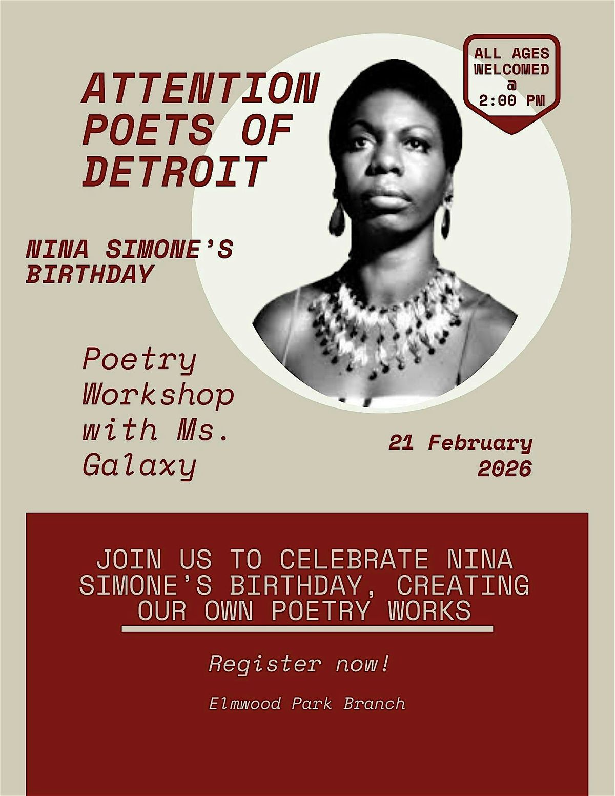 Welcome to the Poetry Workshop with Ms. Galaxy happening at Elmwood Park | Detroit Public Library on February 21, 2026 at 2:00 PM (Eastern Time). Here we will celebrate Nina Simones birthday with a fun and creative session where you can unleash your inner poet! Whether you're a seasoned writer or just starting out, this workshop is perfect for all levels. Get ready to explore different forms of poetry, express your thoughts, and connect with fellow poetry enthusiasts. Don't miss out on this inspiring event!